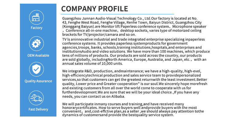 Pokročilé elektrické monitory OLED LCD monitor Lifter sú vhodné pre všetky druhy scén, máme technológiu rezania CNC strojom a laserovú technológiu, najnovšiu technológiu konferenčného stolíka LCD Screen Lifter, aby sme zaistili, že produkt spĺňa mimoriadne vysoké štandardy. Všetky naše OLED lcd zdvíhače patria do Made in China, sú k dispozícii na veľkoobchodný nákup, môžu byť súkromne prispôsobené pre zákazníkov a majú dostatok elektrického zdvíhača LCD monitora s dotykovou obrazovkou na sklade na podporu rýchleho doručenia zákazníkom. A naše vybavenie junnan má rôzne certifikácie certifikátov, ako je CCC, CE certifikát, ROHS, certifikácia ISO, produkt je bezpečný a vysoko kvalitný, s vývoznou kvalifikáciou, je priamou továrňou s priaznivou cenou, má vlastnú továreň a funguje už mnoho rokov.
